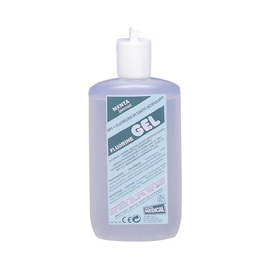 Gel al fluoro senza coloranti disponibile in 2 formulazioni: - A.P.F. acidulato (1 min.), Fluoruro di sodio NaF 0,33% - pH 5,5 per ionoforesi - NEUTRO (4 min.), M.F.P. Monofluorofosfato di sodio 0,33% - pH neutro.